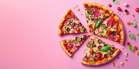Delicious vegetarian pizza with colorful toppings and pizza slices with copyspace background, a fresh, vibrant pizza loaded with vegetables, with slices perfectly arranged and ample space for text or promotional content.