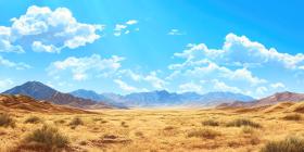 Desert Landscape Under Bright Blue Sky Background, Vast Sandy Desert with a Clear, Vibrant Blue Sky Above
