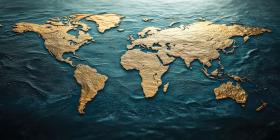 Digital rendering of an abstract world map background, a futuristic and artistic interpretation of the world map with glowing lines and geometric shapes, set against a sleek, dark backdrop to highlight the map contours and connections.