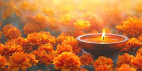 Diya Oil Lamp with Vibrant Orange Marigold Flowers Background, Glowing Diya Surrounded by Bright Marigold Flowers