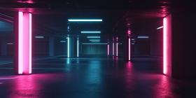 Empty well-lit underground parking lot background, a spacious, dimly lit parking structure with bright overhead lights illuminating the clean, empty spaces, creating a calm and quiet atmosphere with modern, industrial design elements.