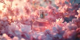 Elegant Perfume Bottle Mockup with Soft Pink Flowers Background, Sophisticated Perfume Bottle Surrounded by Delicate Pink Blooms