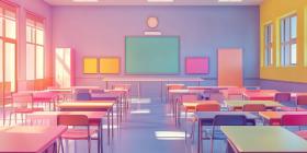 Empty classroom with colorful desks background, a bright and cheerful learning space featuring desks in vibrant hues arranged neatly, with a large whiteboard and windows letting in natural light.