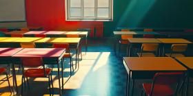 Empty classroom with colorful desks background, a bright and cheerful learning space featuring desks in vibrant hues arranged neatly, with a large whiteboard and windows letting in natural light.