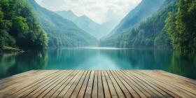 Empty wooden platform by a serene lake, surrounded by lush green mountains, reflecting the tranquil waters, creating a peaceful and calming atmosphere with natures beauty all around.