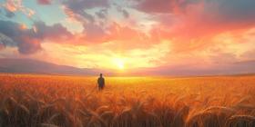 Farmer in Wheat Field at Sunset Background, Silhouette of a Farmer Walking Through a Golden Wheat Field with a Beautiful Sunset Sky in the Background
