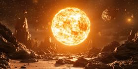 Fiery Sun Illuminating Rocky Alien Landscape Background, Dramatic Alien Terrain with Jagged Rocks and a Blazing Sun Casting Intense Light