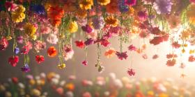 Flowers hanging from the ceiling vibrant background, a colorful display of blooming flowers suspended in mid-air, creating a lively and joyful atmosphere with a mix of bright hues against a soft backdrop.