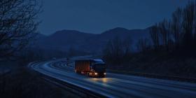 Freight truck driving on a highway at night background, headlights cutting through the darkness as the road stretches ahead under a starry sky, conveying a sense of movement and solitude.