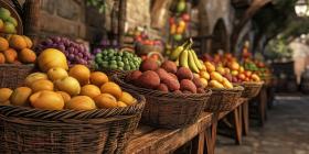 Fresh fruit in baskets at a market background, a vibrant array of ripe fruits like apples, bananas, and oranges neatly arranged in woven baskets, creating a lively and inviting scene filled with natural colors and textures.