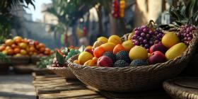 Fresh fruit in baskets at a market background, a vibrant array of ripe fruits like apples, bananas, and oranges neatly arranged in woven baskets, creating a lively and inviting scene filled with natural colors and textures.