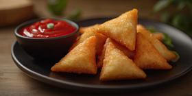 Fried Cheese Triangles on Black Plate with Red Sauce and Copyspace Background, Crispy Cheese Triangles Served with Tangy Red Sauce in a Simple, Elegant Setting