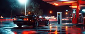Fuel Nozzle Inserted into Car at Gas Station at Night Background, Nighttime Scene with Illuminated Gas Pump and Car at the Station