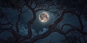 Full moon through twisted tree branches at night background, the glowing moon visible through the gnarled and intricate branches of a tree, casting soft light across the dark sky, creating a mysterious and atmospheric scene.
