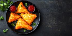 Fried Cheese Triangles on Black Plate with Red Sauce and Copyspace Background, Crispy Cheese Triangles Served with Tangy Red Sauce in a Simple, Elegant Setting