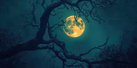 Full moon through twisted tree branches at night background, the glowing moon visible through the gnarled and intricate branches of a tree, casting soft light across the dark sky, creating a mysterious and atmospheric scene.