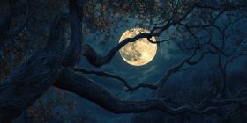 Full moon through twisted tree branches at night background, the glowing moon visible through the gnarled and intricate branches of a tree, casting soft light across the dark sky, creating a mysterious and atmospheric scene.