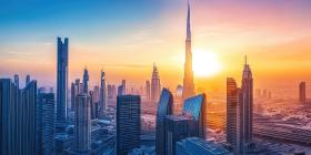 Futuristic cityscape at sunset with skyscrapers background, towering, sleek skyscrapers silhouetted against a vibrant orange and purple sunset sky, with glowing lights and a dynamic, modern feel, evoking a sense of innovation and progress.