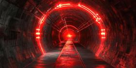 Futuristic tunnel with glowing red laser lights background, a sleek, high-tech corridor illuminated by vibrant red lasers, creating a dynamic and immersive atmosphere with sharp, glowing beams cutting through the dark surroundings.