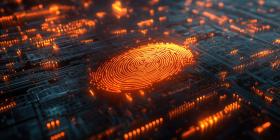 Glowing Fingerprint on Circuit Board Background, Illuminated Fingerprint Integrated with High-Tech Circuitry in a Futuristic Design