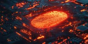 Glowing Fingerprint on Circuit Board Background, Illuminated Fingerprint Integrated with High-Tech Circuitry in a Futuristic Design