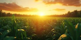 Golden sunrise over a lush green field background, warm sunlight casting a golden glow across the vibrant green landscape, with soft rays illuminating the horizon and creating a peaceful, serene morning atmosphere.
