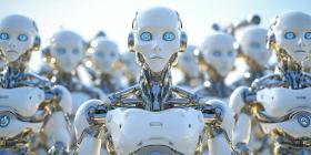 Group of highly detailed futuristic modern AI robots background, a collection of sleek, advanced humanoid robots with intricate designs and glowing elements, standing together in a high-tech environment, showcasing cutting-edge technology and innovation.