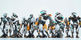 Group of highly detailed futuristic modern AI robots background, a collection of sleek, advanced humanoid robots with intricate designs and glowing elements, standing together in a high-tech environment, showcasing cutting-edge technology and innovation.