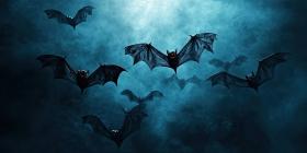 Halloween bats flying in the night sky background, silhouetted bats soaring against a dark, eerie sky lit by a glowing full moon, creating a spooky and atmospheric Halloween scene.