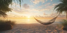 Hammock on a sandy beach at sunset background, gently swaying between palm trees as the sky is painted in warm hues of orange and pink, creating a peaceful, serene atmosphere.