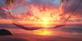 Hammock on a sandy beach at sunset background, gently swaying between palm trees as the sky is painted in warm hues of orange and pink, creating a peaceful, serene atmosphere.