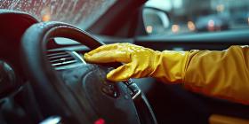 A hand wearing gloves wipes down the dashboard of a car background, the gloved hand cleaning the smooth surface with a cloth, ensuring a tidy and polished interior in a well-lit environment.