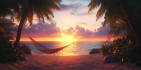 Hammock on a sandy beach at sunset background, gently swaying between palm trees as the sky is painted in warm hues of orange and pink, creating a peaceful, serene atmosphere.