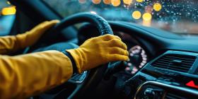A hand wearing gloves wipes down the dashboard of a car background, the gloved hand cleaning the smooth surface with a cloth, ensuring a tidy and polished interior in a well-lit environment.