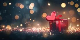 Heart shapes and a gift box with sparkling lights background, glowing hearts and a beautifully wrapped gift box surrounded by twinkling lights, creating a magical and romantic atmosphere perfect for Valentines Day or love celebrations.