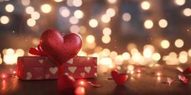 Heart shapes and a gift box with sparkling lights background, glowing hearts and a beautifully wrapped gift box surrounded by twinkling lights, creating a magical and romantic atmosphere perfect for Valentines Day or love celebrations.