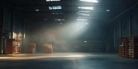 Industrial Warehouse Interior with Bright Lighting Background, Spacious Warehouse with High Ceilings and Illuminated by Bright Lights