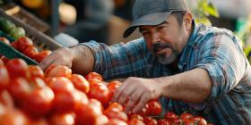 Hispanic man arranging fresh tomatoes at an outdoor market background, vibrant red tomatoes neatly displayed on wooden crates, with a bustling market atmosphere and sunlight casting a warm glow.