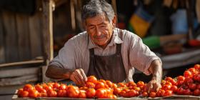 Hispanic man arranging fresh tomatoes at an outdoor market background, vibrant red tomatoes neatly displayed on wooden crates, with a bustling market atmosphere and sunlight casting a warm glow.