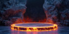 Large Round Lava Podium Stage Background, Dramatic Stage with a Glowing Lava Platform Surrounded by Intense Lighting and Fiery Effects