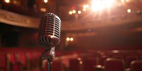 Microphone Against Softly Blurred Auditorium Background, Focused Microphone with a Faintly Blurred Auditorium Setting