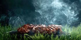 Meat on a grill with smoke sitting on green grass, surrounded by fresh, vibrant grass and open space, with room for text or branding, evoking a casual outdoor barbecue or picnic atmosphere.