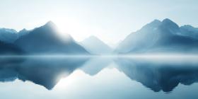 Misty mountainside over calm waters background, soft mist rolling over the rugged mountain peaks, reflecting gently on the tranquil water below, creating a serene and peaceful landscape.