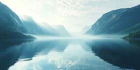 Misty mountainside over calm waters background, soft mist rolling over the rugged mountain peaks, reflecting gently on the tranquil water below, creating a serene and peaceful landscape.
