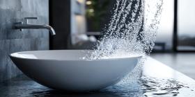 Modern bathroom sink with flowing water background, sleek, contemporary design with a gentle stream of water cascading from a polished faucet, creating a clean, refreshing ambiance.
