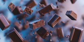 Multiple chocolate bar pieces flying in the air background, chunks of rich, glossy chocolate breaking apart and floating against a smooth backdrop, creating a dynamic and indulgent scene full of movement and texture.