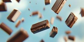 Multiple chocolate bar pieces flying in the air background, chunks of rich, glossy chocolate breaking apart and floating against a smooth backdrop, creating a dynamic and indulgent scene full of movement and texture.