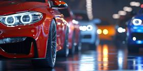 Row of cars on an assembly line background, neatly aligned vehicles moving through the production process, with workers and machinery in the backdrop, highlighting the industrial setting.