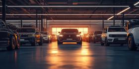 Row of cars on an assembly line background, neatly aligned vehicles moving through the production process, with workers and machinery in the backdrop, highlighting the industrial setting.