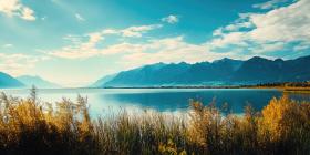 Natural scene with mountains and lakes background, majestic mountains towering in the distance, their peaks reflected in the calm waters of a serene lake, surrounded by lush greenery, creating a peaceful and awe-inspiring landscape.